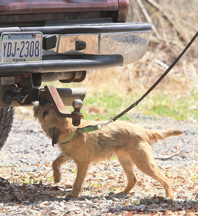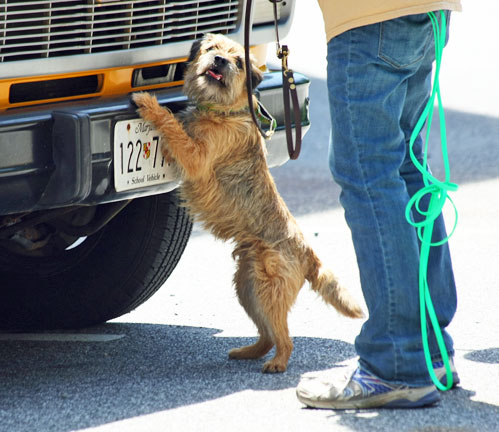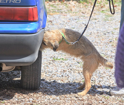 We finally got to the vehicles, four of them, three cars and one truck, each making a side of a square. There were two hides and we had 3 minutes. Fells started and went to the side of the car closest to the start and gave it a small sniff and then walked to it's rear as to circle and go into the center of the square, but at the rear of the car he got the scent around the license plate. He sniffed down from the license plate and then wanted to go diagonally from the plate to the rear tire on the outside of the square (where he had just been). I kept him pretty much out from under the car, but allowed him to circle around to the tire and he quickly found the hide. I said alert and praised and treated him and then told Fells to find another hide. Unfortunately then Fells became very distracted by the area.