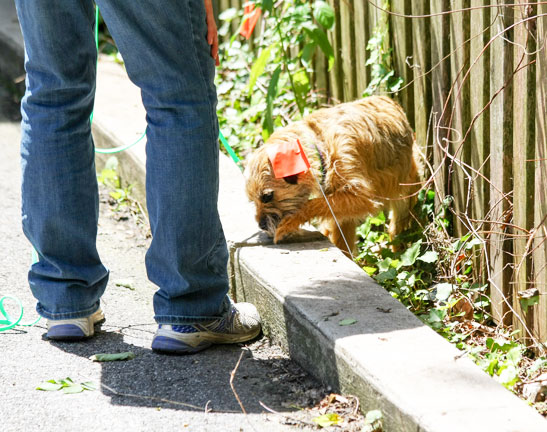 We went right to exterior from vehicles. Fells and I lined up at the start and directly in front of us, about 10 feet away was a pair of empty pallets with one somewhat on top of the other. Then behind them was lots of other things including two pallets with stuff on them. On the right of the pallets was empty ground to the curb and then onto grass/dirt holding boundary flags for this area. The grass dirt was out of play. To the left was a lot of junk all against the wall of the building with a couple of doors leading into the building. The empty pallets just called to Fells and he drove right from the start line to them. I took note that we had missed the first bit of the area and kept with him. He found a hide under the pallets where he couldn't get to it, but it was there. One found. We then circled the area checking all that we reached until we were back to start. I tried to make sure that we covered all the ground. Then right at the start area Fells jumped onto the grass/dirt area and started sniffing. I suspected small furry things had been there. He followed it back to a large crack in the curb. It was large enough that I could see into it and I saw nothing. Then Fells gave his "found the hide" signal. I was confused and thought that it was rat poop in there, but it was the right signal so I called alert and the judge said yes. I said finish and we were done.