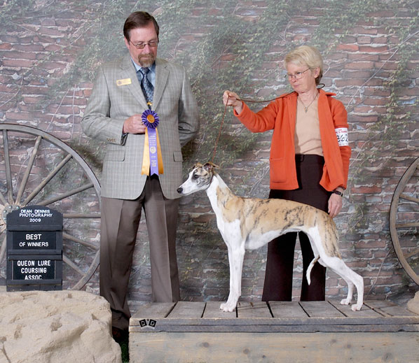 Although I am sure she would sooner have been coursing with mom, pop and brother Rupert at the CanAm, Robyn managed to keep four on the floor and go Winners Bitch and Best of Winners for 3 points at the QUON Specialty in St. Lazare, QC on May 16, 2009 under judge Bob Rowbotham.