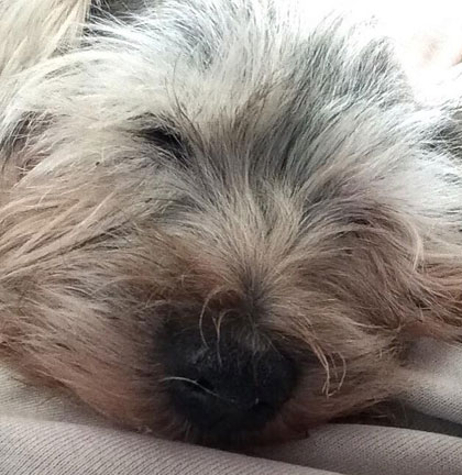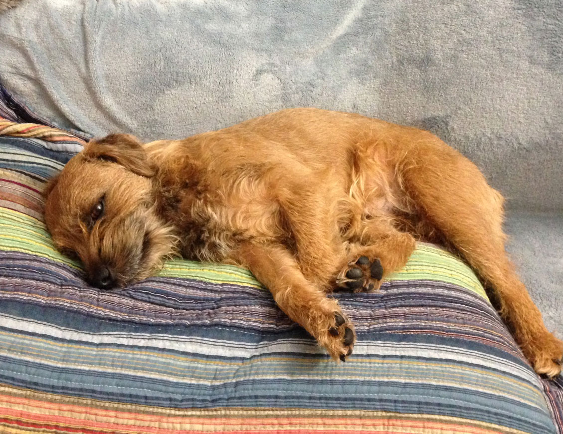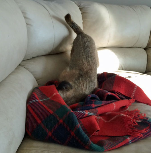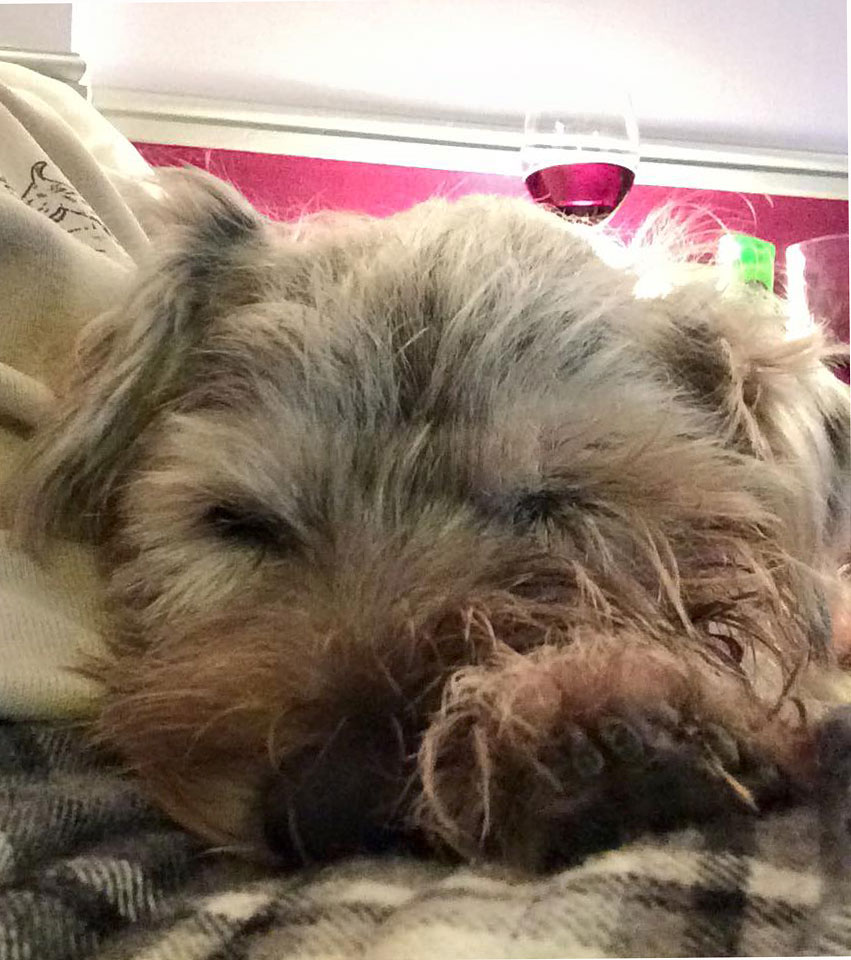 Pip, home from "The Pip & Peeps Love and Laughter Tour of 2016" doing what dogs do best...