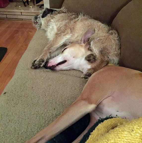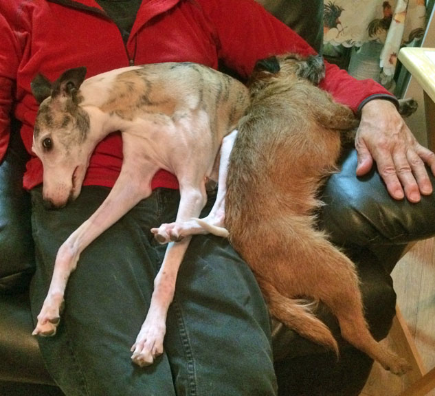 Robyn and Tank Whippets are OK to lie on, albeit a bit bony...