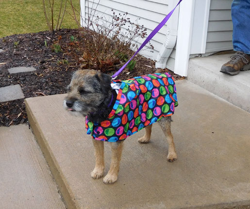 April showers, Gryzia, on extended vacation with Richard and Andrea, sports a spiffy raincoat, such a good sport!