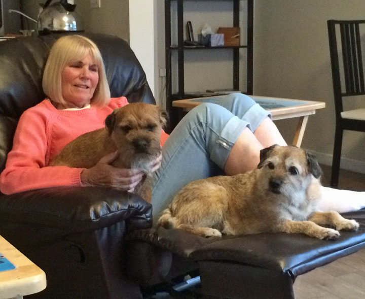 Chris' cousin Sue came to visit from Spain and the dogs were quick to take advantage. Boomer and Digger found they could both fit on the comfy chair with a bit of "Sue squishing"!