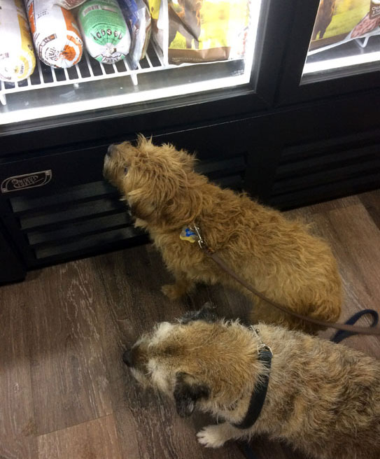 "Hey, Boomer, I think the rabbit's here" Boomer and Hazel out shopping