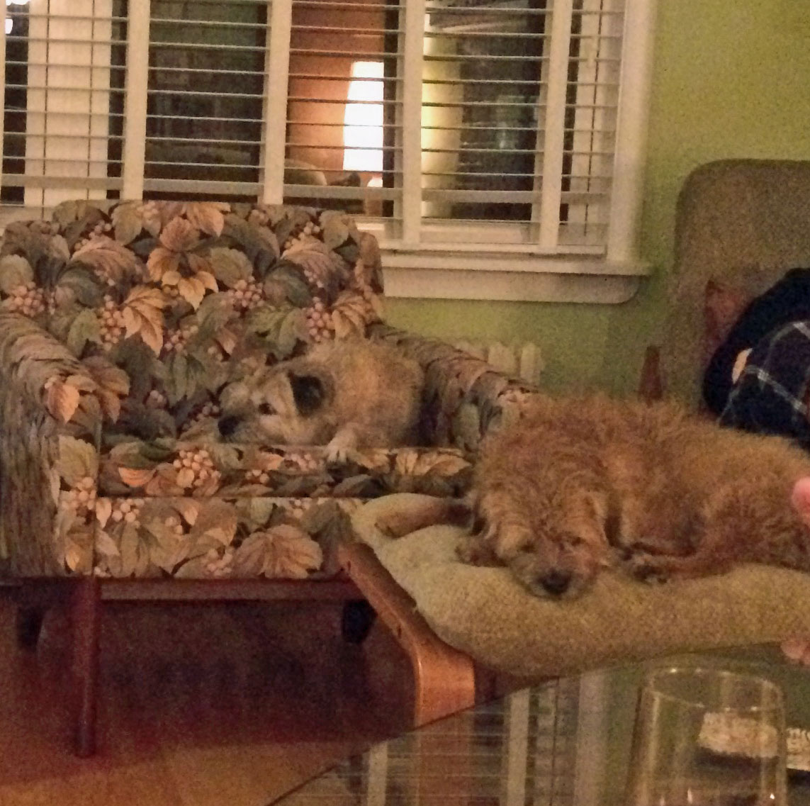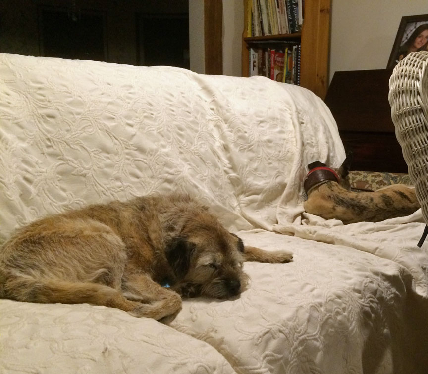Boomer and Robyn chez Mark & Michele - doing something they would never do at home, peacefully sharing a sofa!