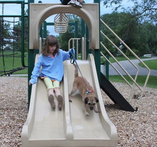 tries out the mini slide with Bailey