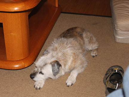 Fi keeps an eye on a visiting bird - Hopefully she won't take "eat crow" literally. It was "four and twenty BLACKBIRDS baked in a pie"