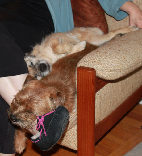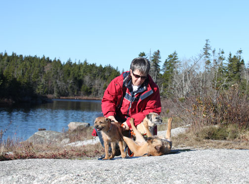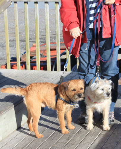 Hazel and Maggie are unimpressed by Geordie's antics on our lakeside walk.