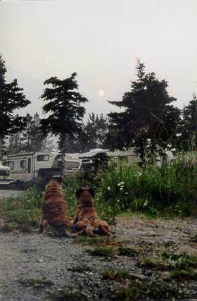 Although it appears that Gizmo and Gremlin are watching the hazy sun, they are actually waiting for Beth to return to the campsite. The picture on the left was taken on July 1, 2004 after a visit to White Horse. The haze is caused by the forest fires that were burning in BC and Alaska at that time.