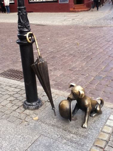 Sculpture commemorating a famous Polish poet who used to come frequently with his dog, hat & umbrella to the Market Place in Torun.