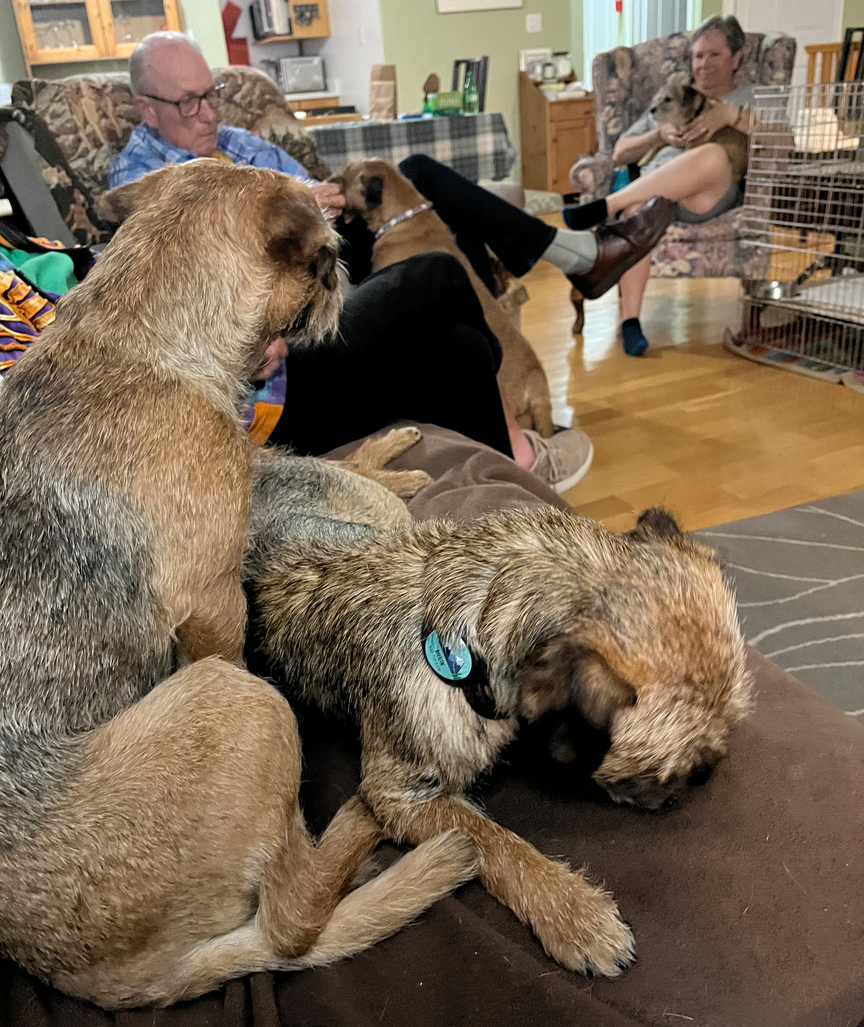 Sprite and Tatters hang out on the sofa while Scrapper cuddles with Anne and Digger sucks up to Frank