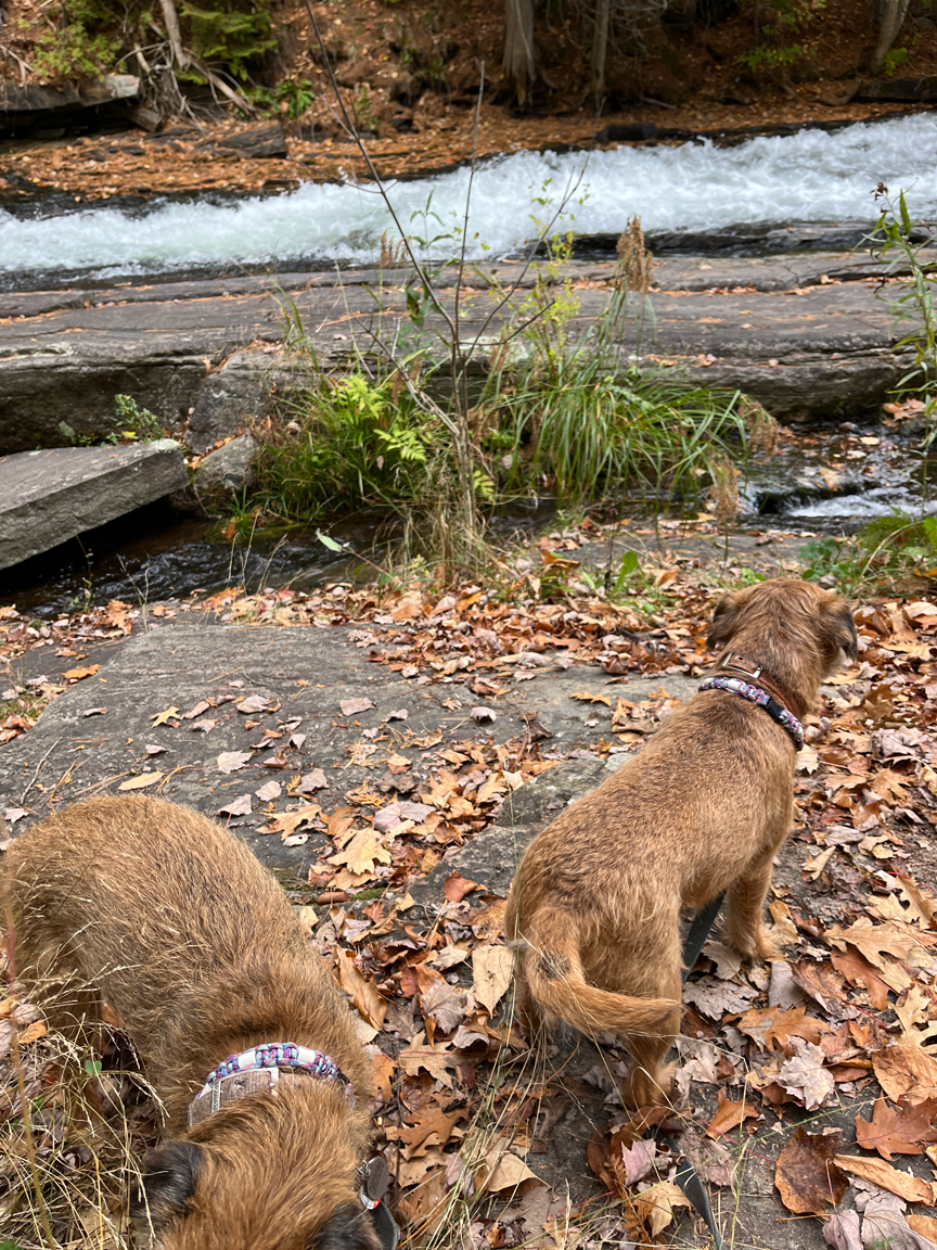 Digger and Pickles enjoying a sniffari at Buttermilk Falls while Chris locates a geocache on route to Huntsville