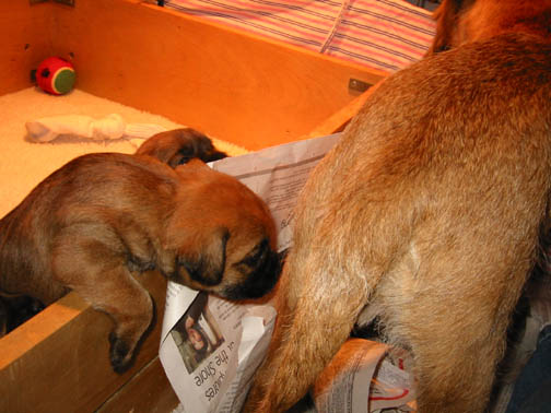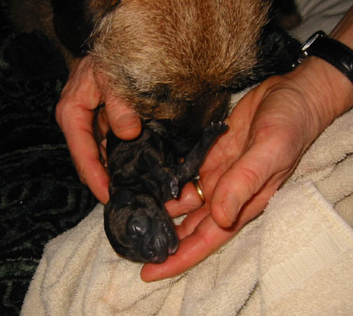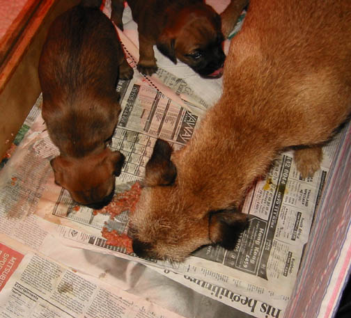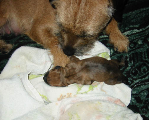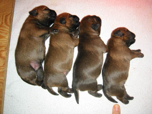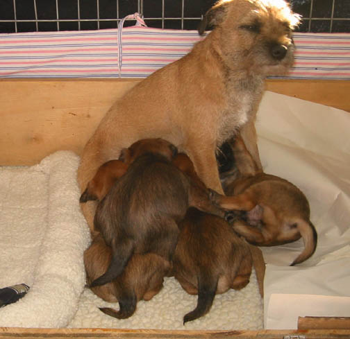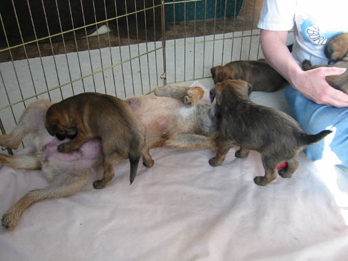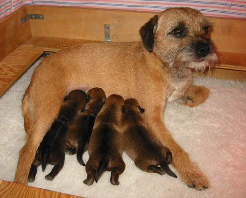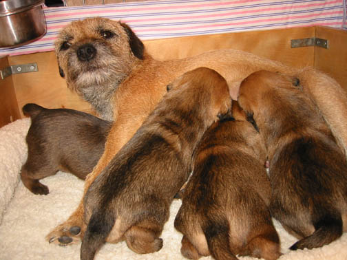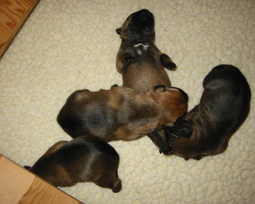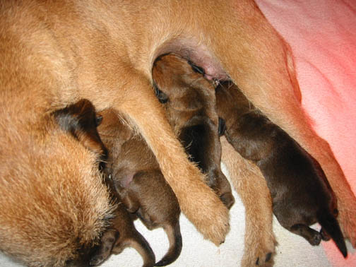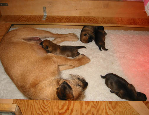 Proud momma and 6 day-old pup-a-lumps (2,1,4,3)