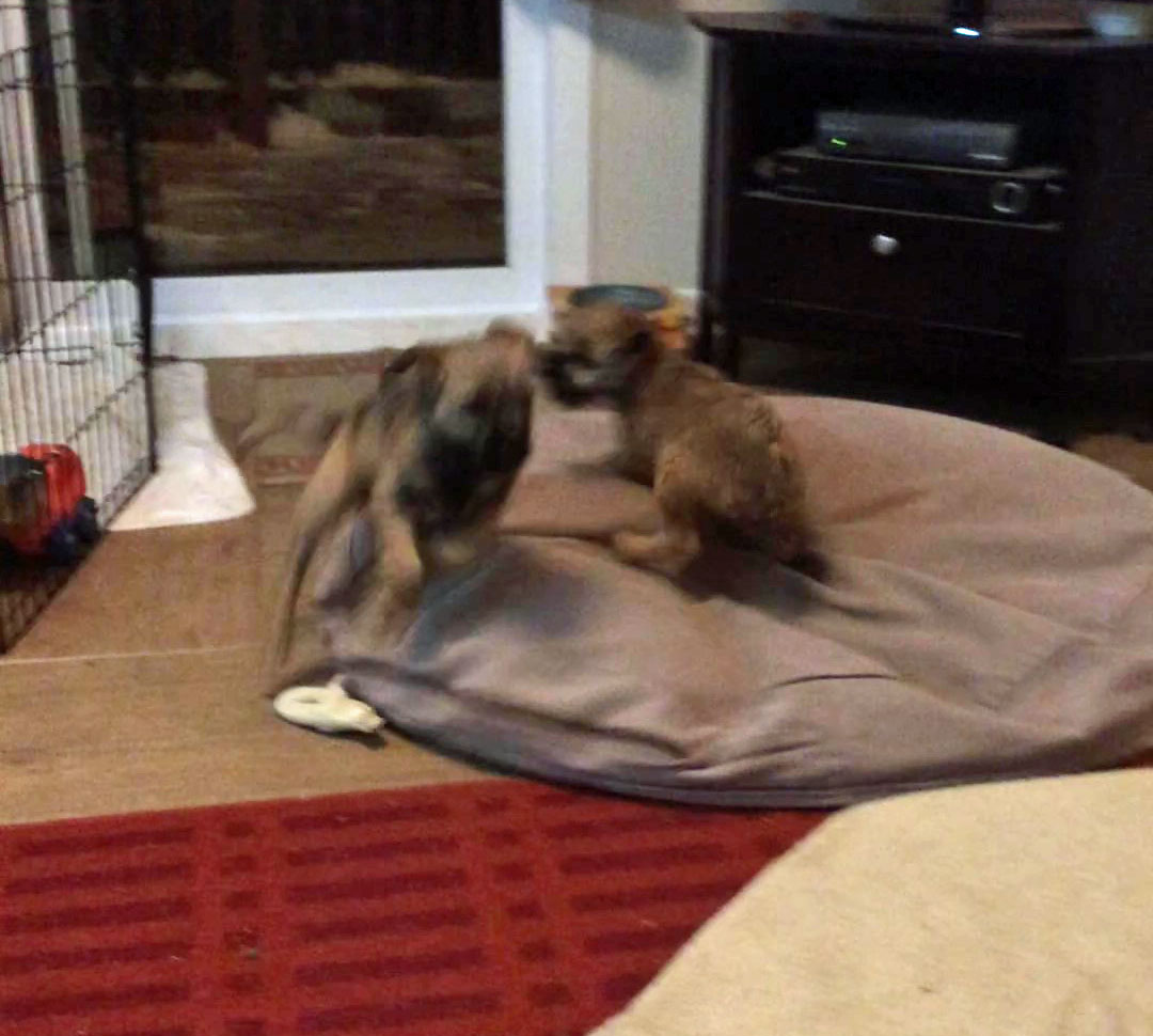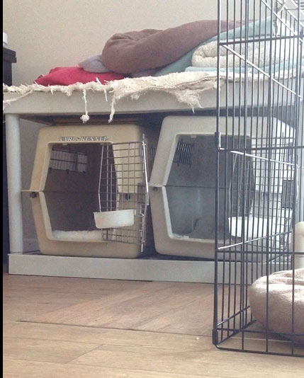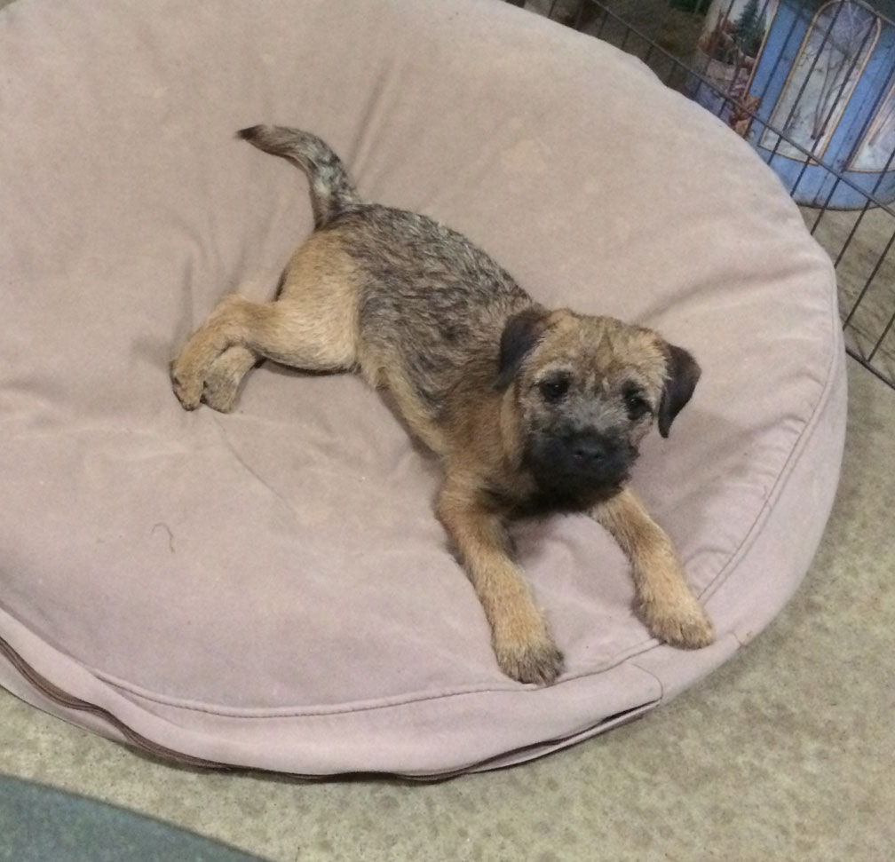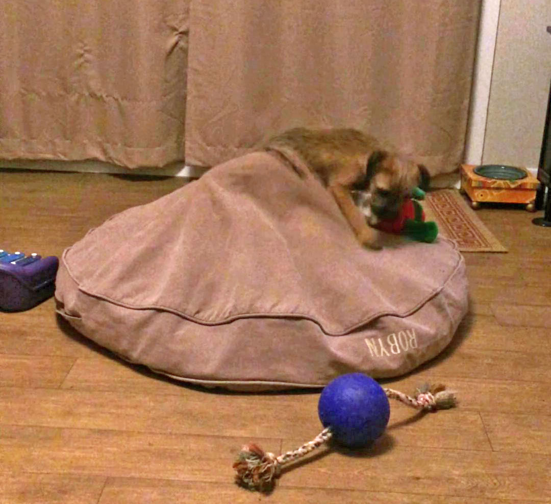 Ruby "going to ground". In fairness, she was not responsible for the "entrance" into the dog bed