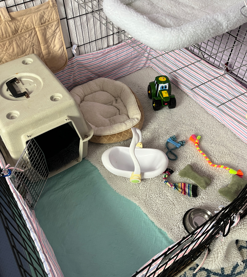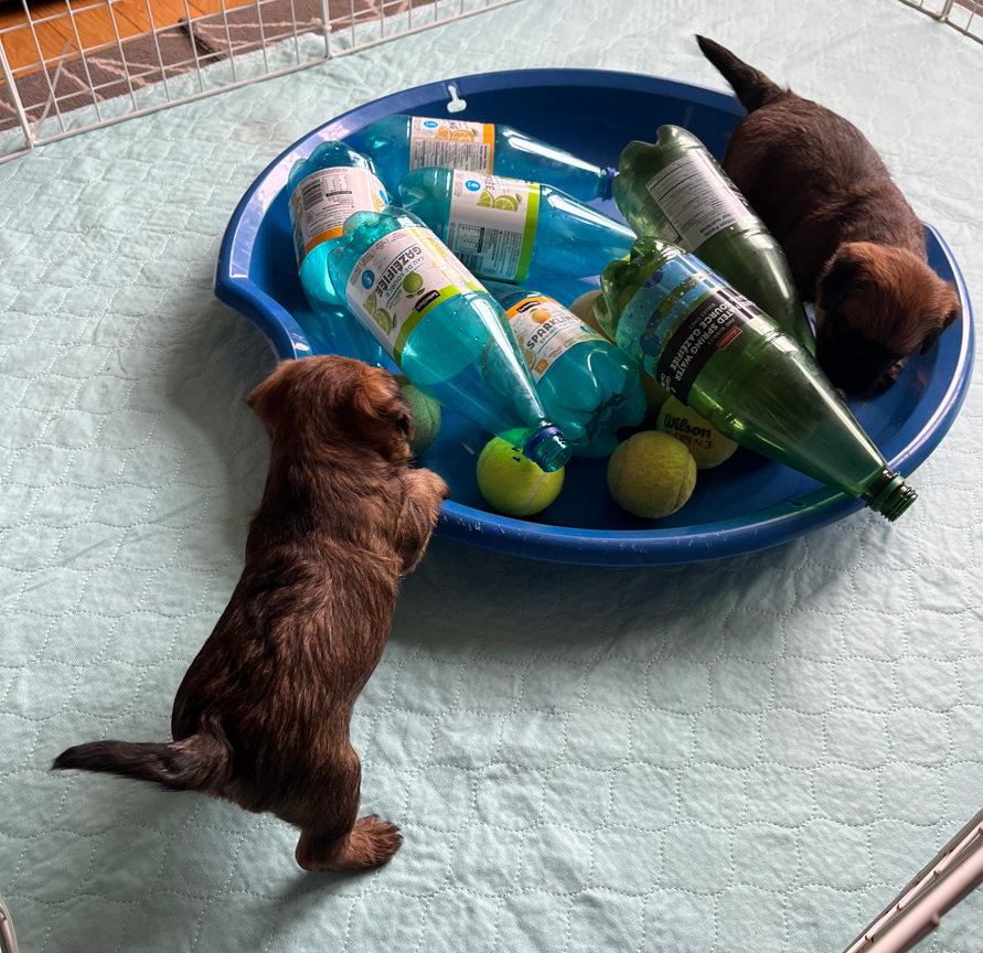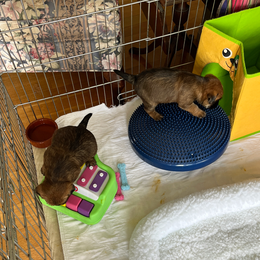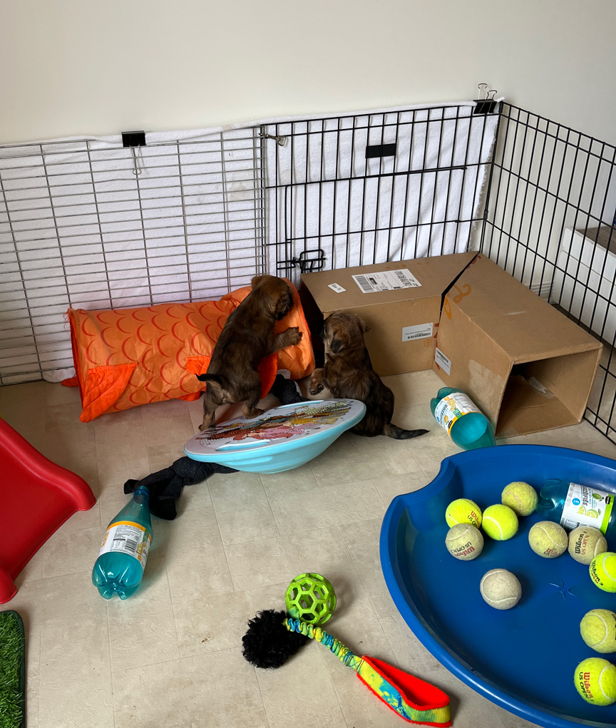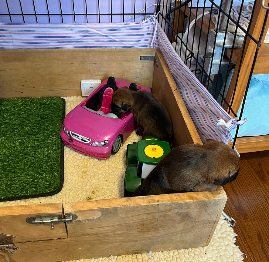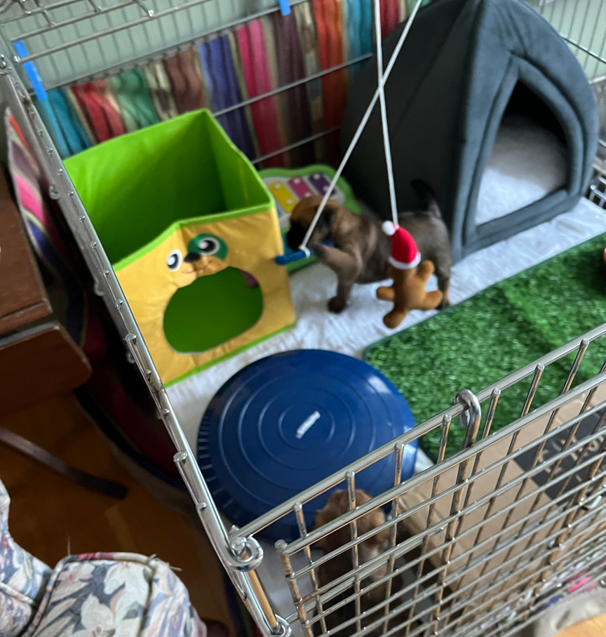 The puppy pen in the living room where they spend much of their day and soon their evenings as well. The toys and bed get switched around. There are little toys they can carry, the hanging toys when they are supervised and the tunnel which will be moved to the big pen.