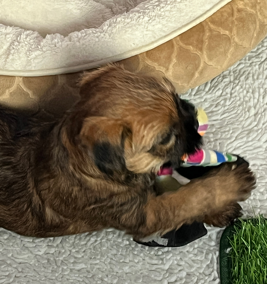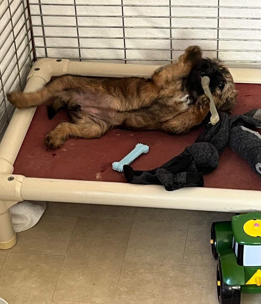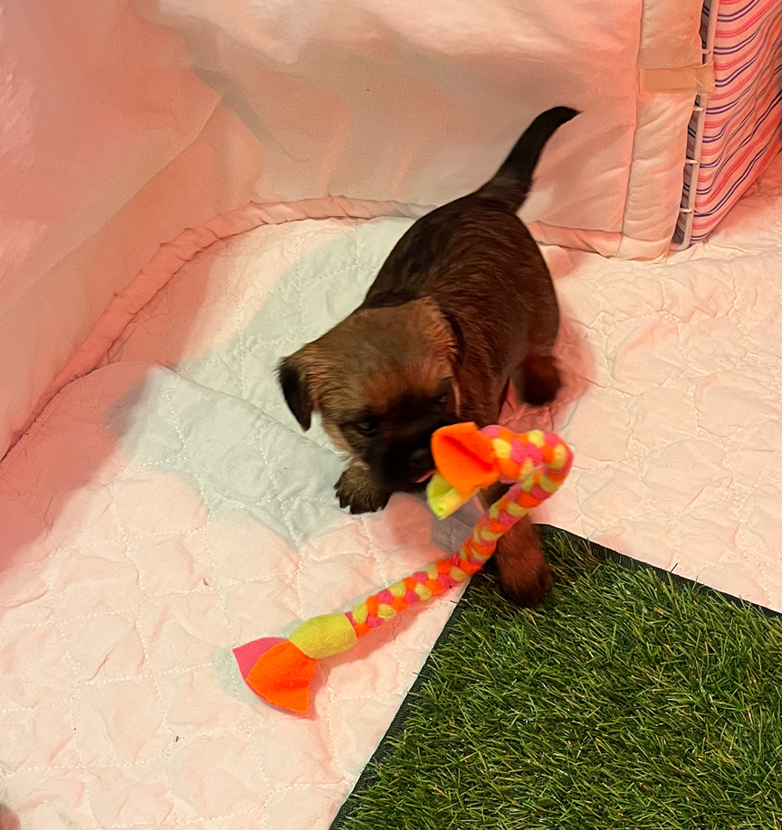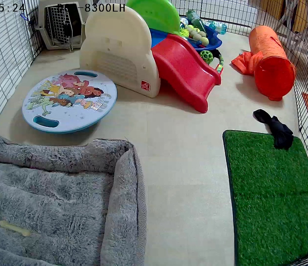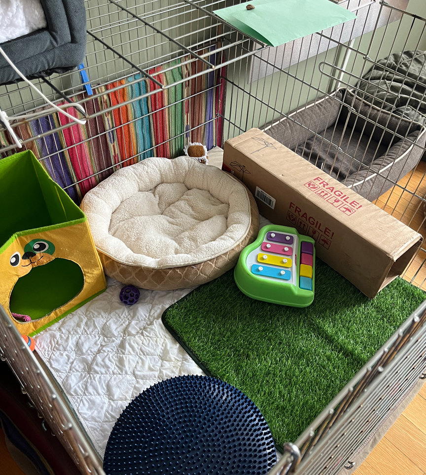 The puppy pen in the living room where they spend much of their day and soon their evenings as well. The toys and bed get switched around. There are little toys they can carry, the hanging toys when they are supervised and the tunnel which will be moved to the big pen.