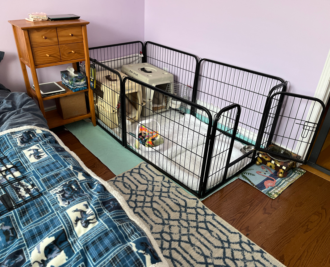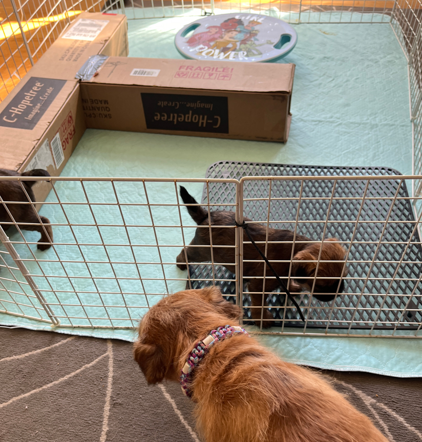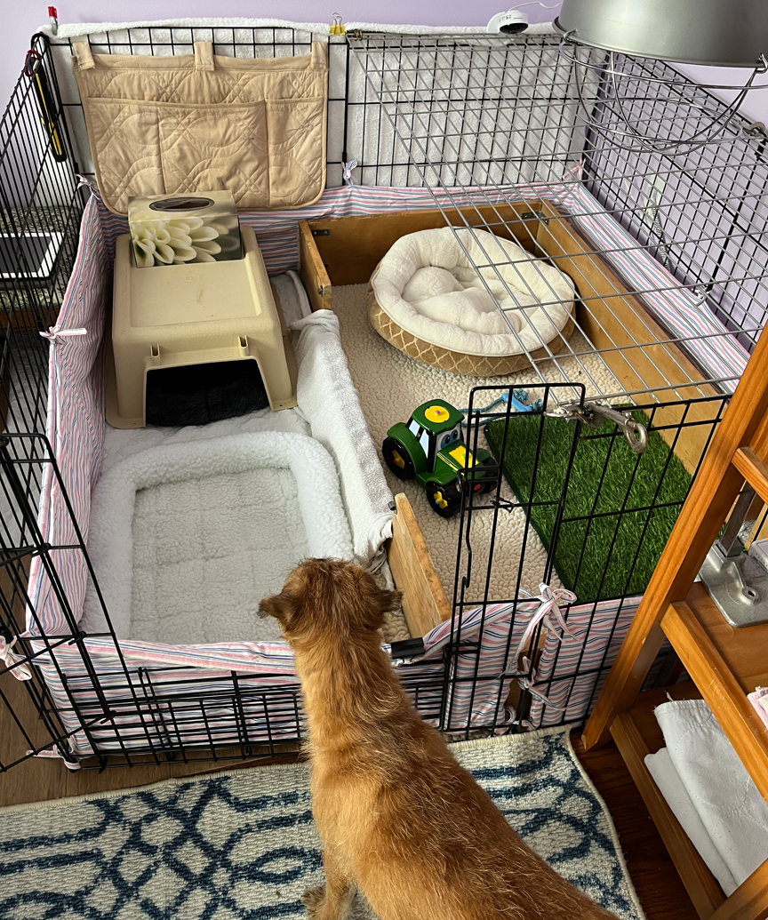 The puppy room pen in its final configuration. The crate comes out at night so that I can see them without having to sit up (and disturb them). Depending on weather when the time arrives, this is where they may start sleeping in crates.