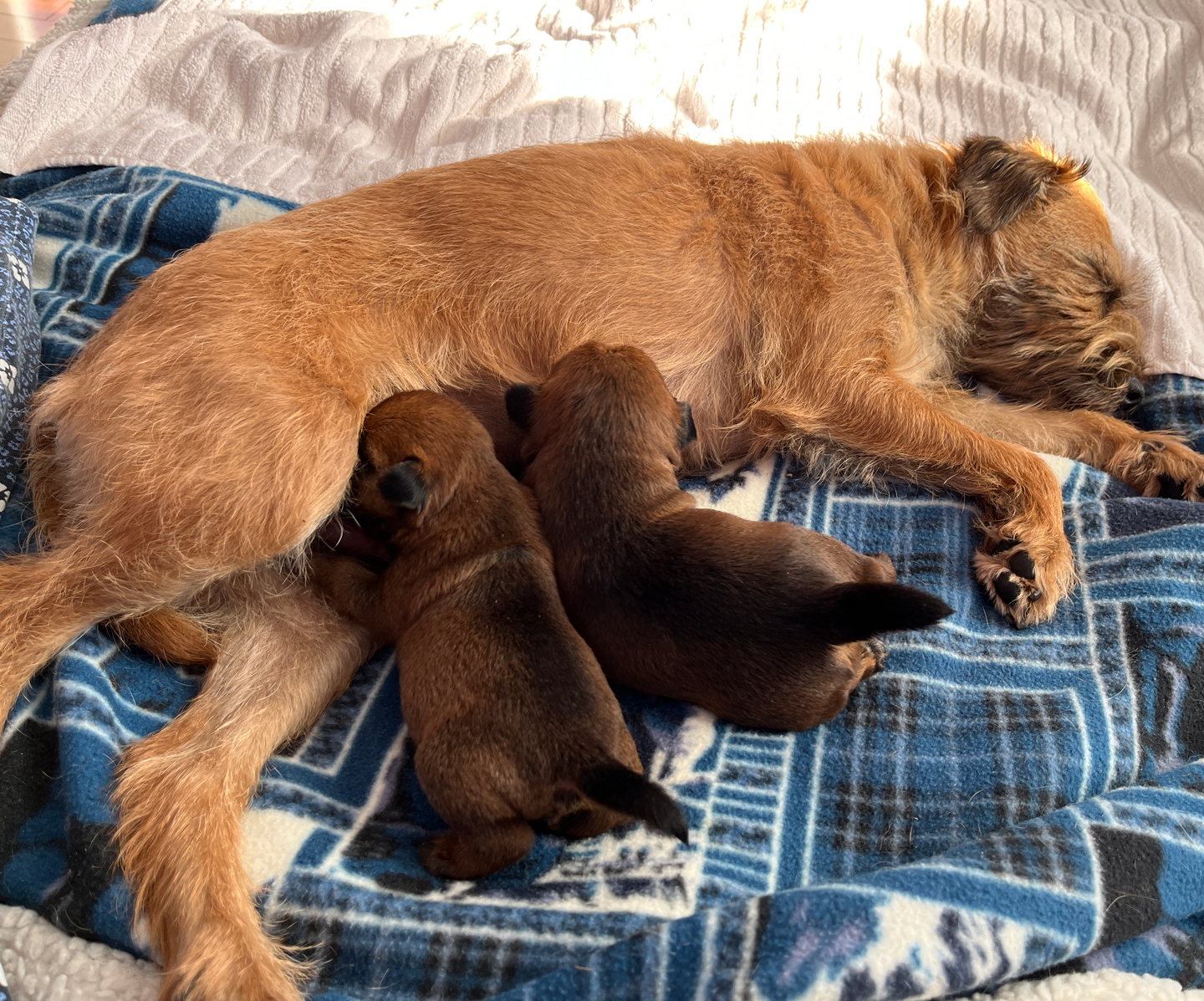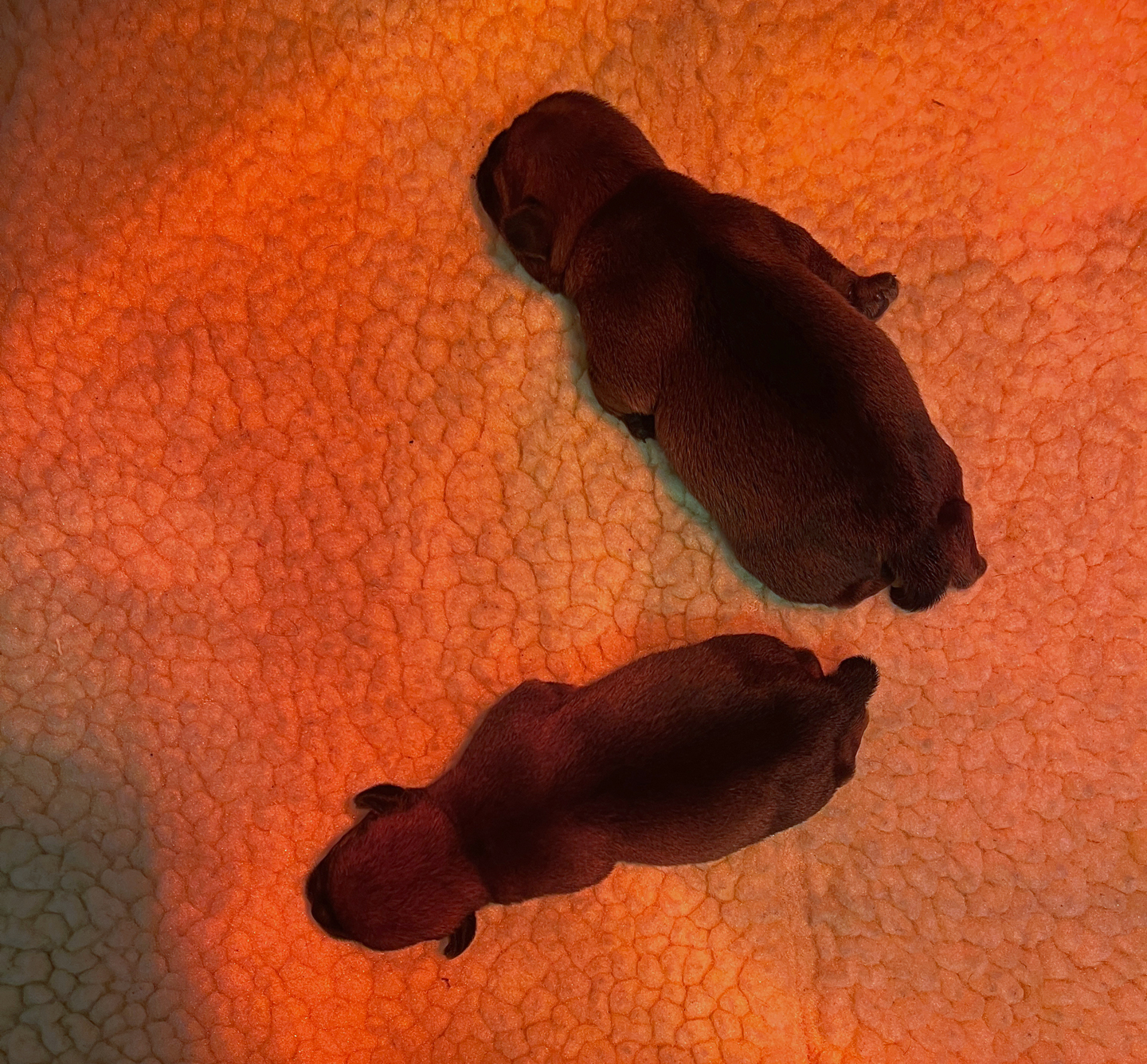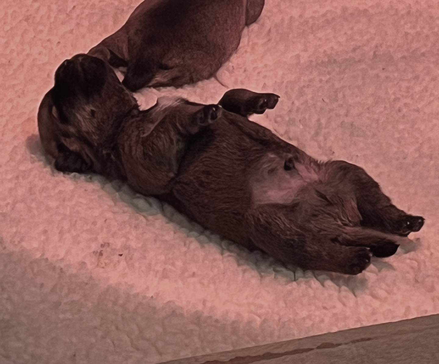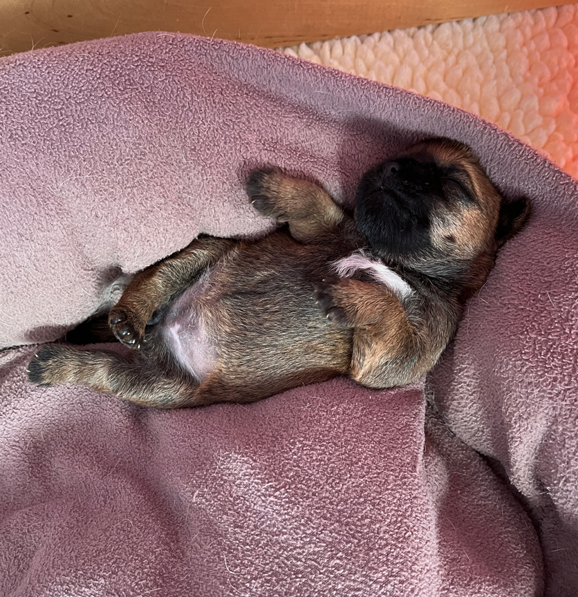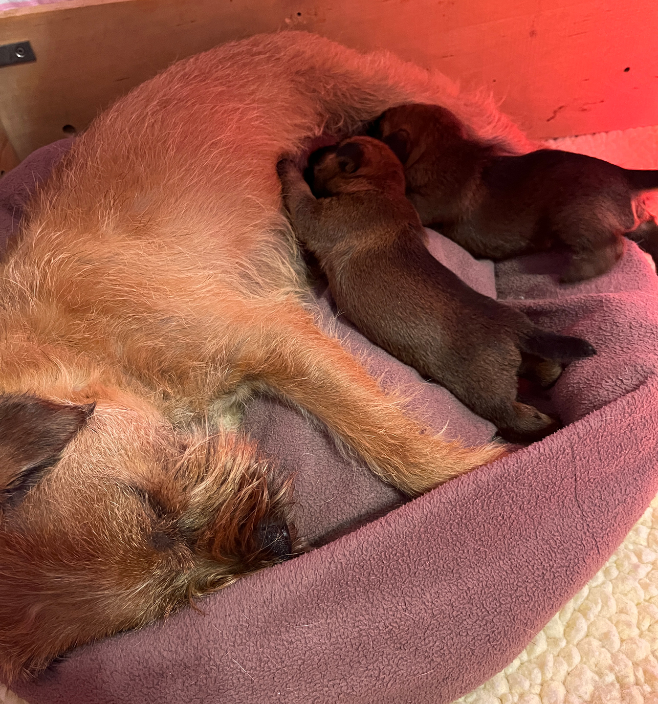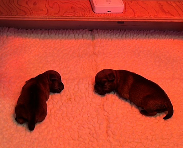 Basking in the warmth of the heat lamp at the tropical end of the oversize whelping box with a warming pad underneath for an added touch. It doesn't get much better!!!