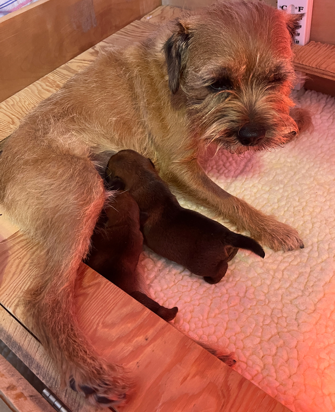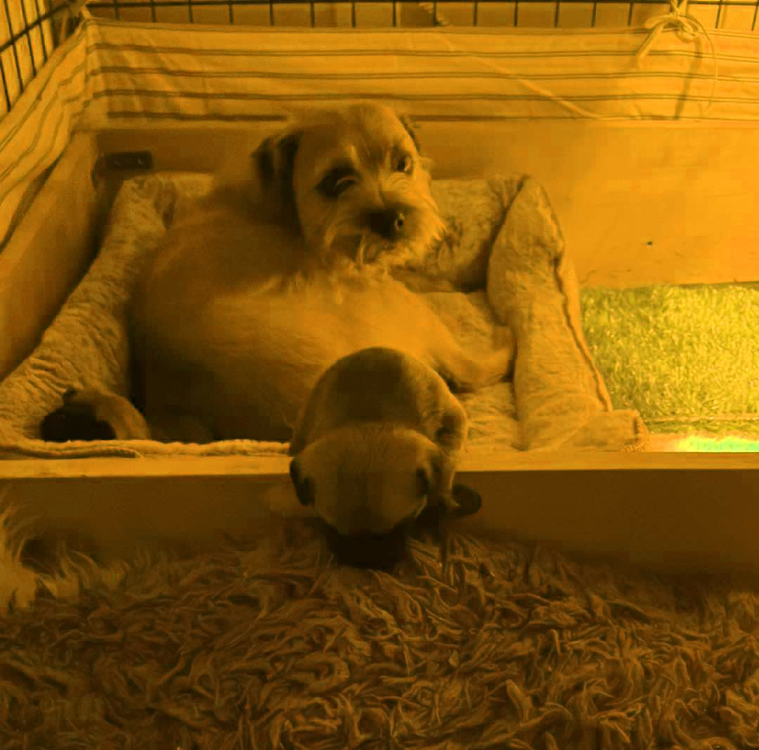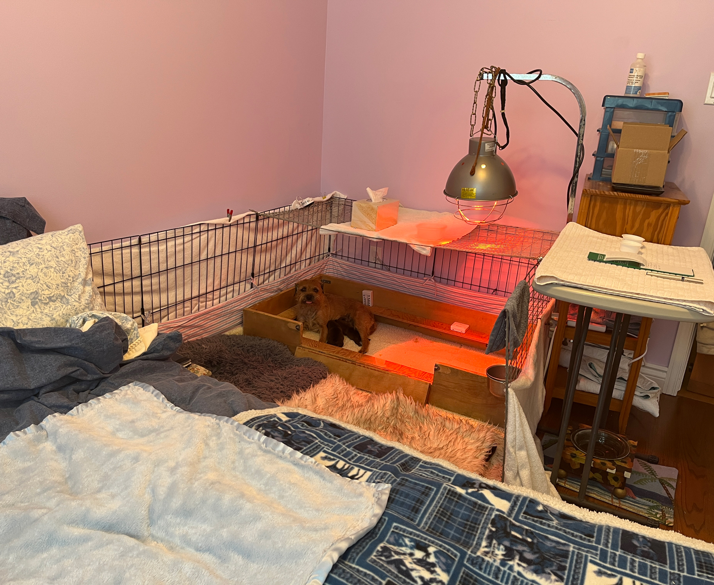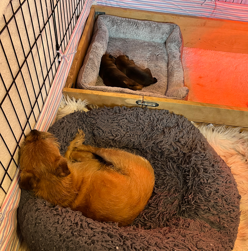 Our neonatal puppy room set up, it has been through a variety of iterations over the 43 years I have been breeding but the box (made by Chris) has been a constant