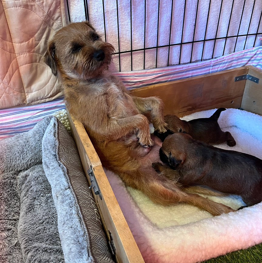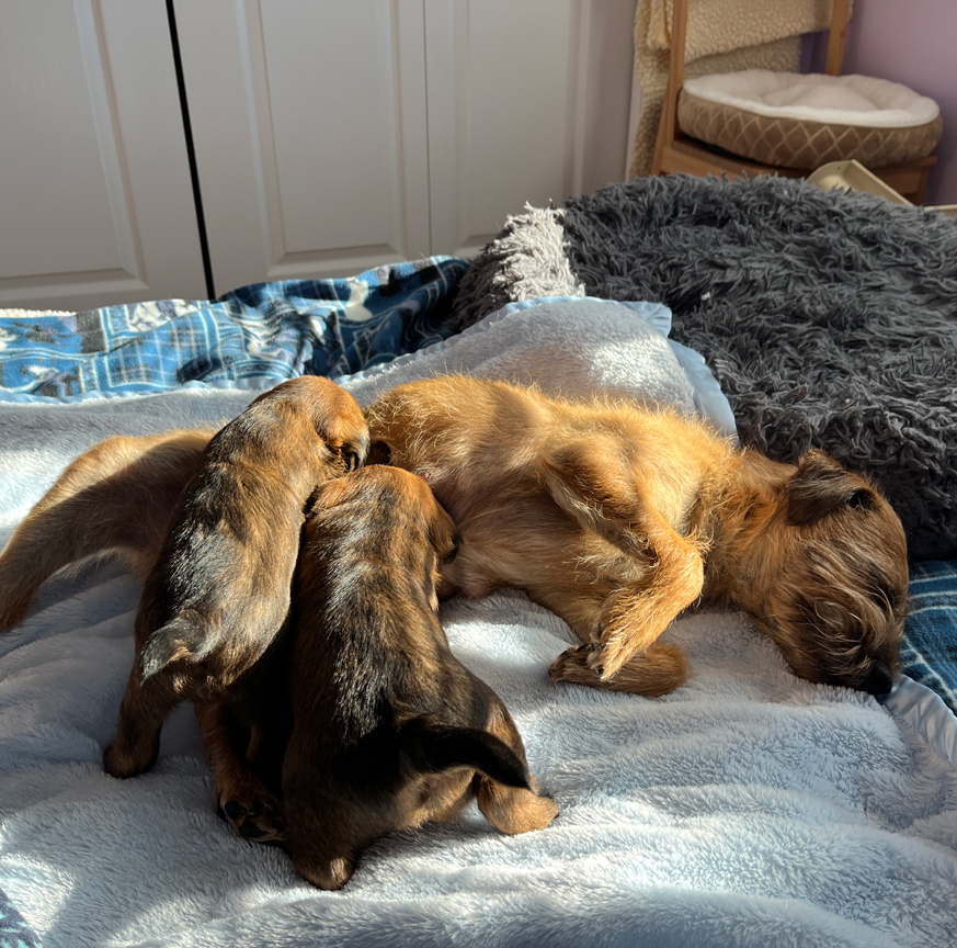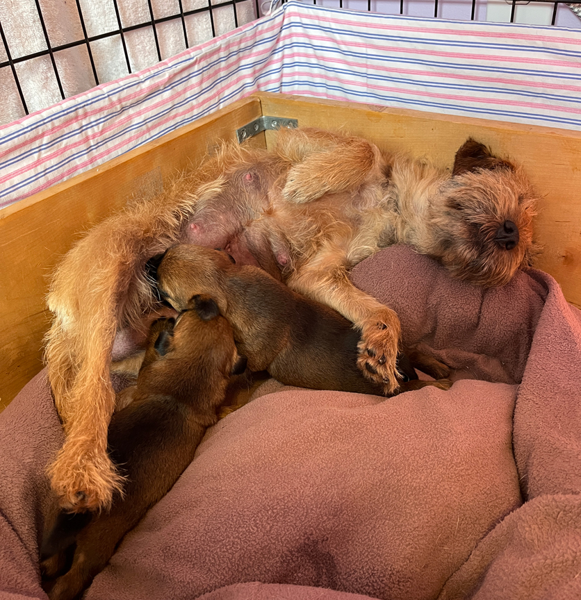 Pups are developing nicely and Pickles is doing well despite throwing us a few curve balls. It seems that the fleecy bedding in the whelping box which has delighted all our previous bitches is not up to Pickles' standards. The first hint was when I tried letting her feed them on my bed, an arrangement that resulted in a much calmer but attentove mealtime.