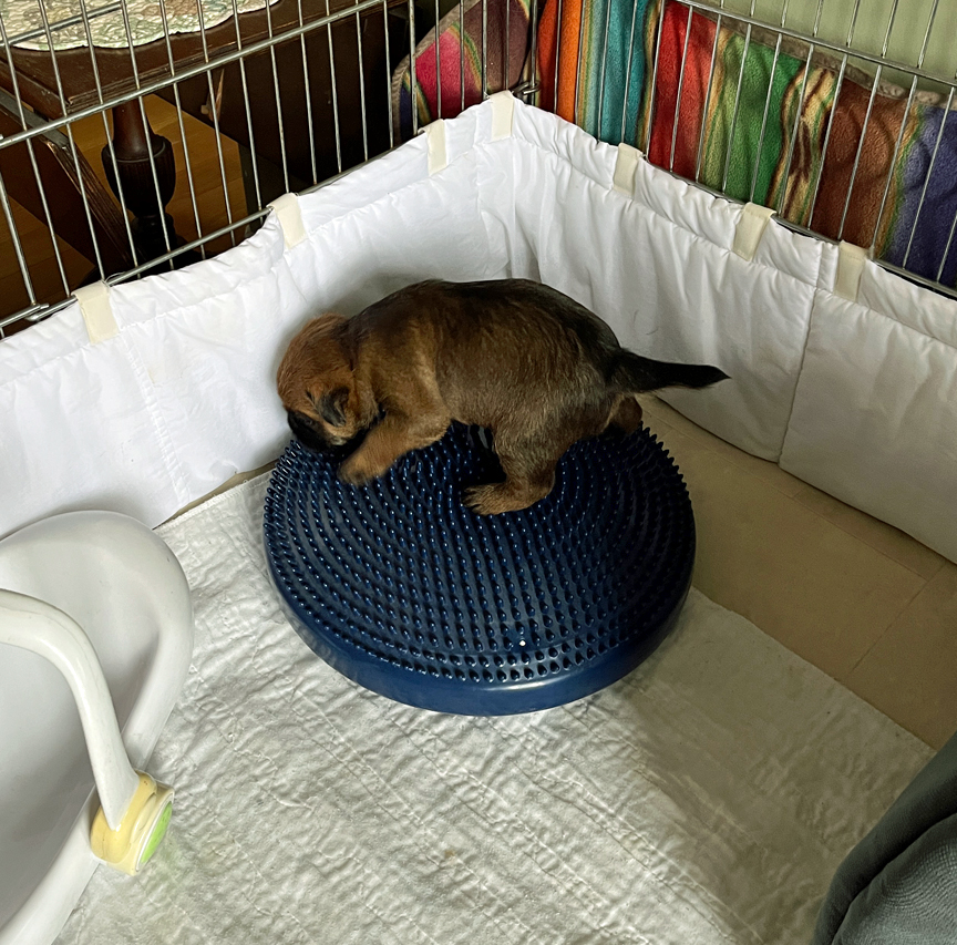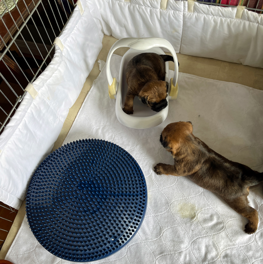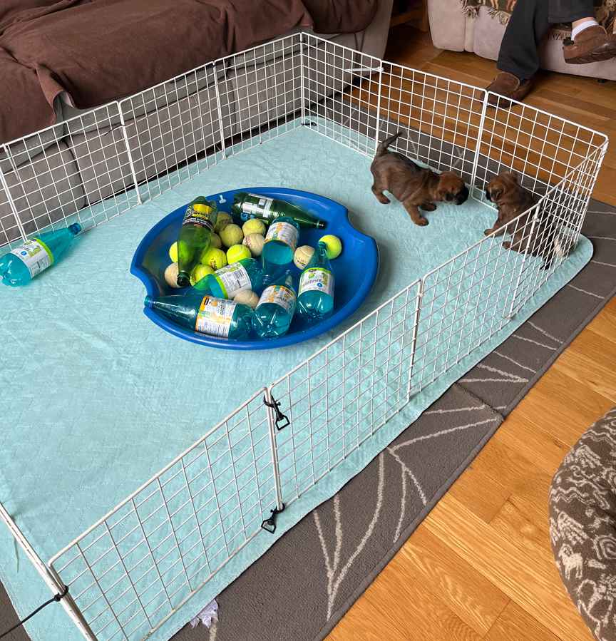 The temporary pen we set up in the living room to give them a large area to play in and explore different surfaces and obstacles. So far they have tackled the bottle and ball pool, the wobble board and a more complex tunnel. Eventually the fencing will be used to puppy proof the deck and staircase banister.