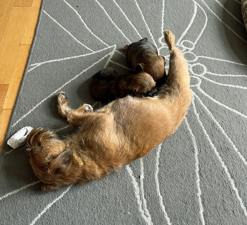 Then I thought it would be nice to put a soft snuggly in the box for the pups, they absolutely loved it. So did Pickles! she went in to check it out, liked it and lay down. For the first time, Pickles did not immediately abandon her Gherkins after they had finished feeding, instead she stayed in the bed with them for several minutes. A definite small step in the right direction.