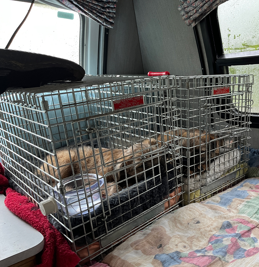 Consummate campers, this is how they chilled at the Specialty, They did get to sleep in mom and dad's crates at night for more space.