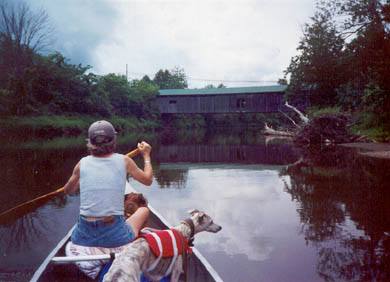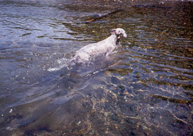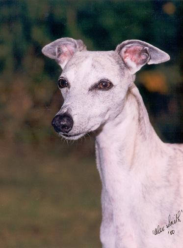That was the start of a fourteen-year adventure. She coursed, camped and canoed. She hunted with the terriers, locating active holes with unerring accuracy but never participating in the rough stuff. She counter cruised to the detriment of several dishes and raided cupboards to the occasional detriment of her digestive system until we found a foolproof system of bungees, and other whippet-proof devices. She weathered the ice storm of 1998 with barely a shiver - instinctively finding and claiming the warmest spot in our chilly house. She travelled everywhere with us, making friends - two-legged and four - wherever she went.