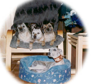 She was a young, playful and over indulgent Aunt to our 1993 litter - (much to their Dam's annoyance) and they always remembered her, no matter how long the absence, greeting her with butt wiggles and submissive mouth licks. She was more matronly towards the 1997 litter but became Gunter's best buddy when for 2-1/2 years we were down to a two-dog household. They were indeed the "odd couple" he would nuzzle her muzzle and she would chew his legs as they lay on the sofa together. Always the extrovert, she happily accepted the arrival of Boomerang in January 2003. They became the wild ones, firing each other up in a barking frenzy and racing around the yard together at high speed. She also welcomed Zeke without question a few months later, adopting the Auntie Nipper role once more. Even the influx of Danny and Daisy as a result of Jenny's serious illness in December 2005 and the subsequent arrival of Daisy's pups was of no concern; she was totally reliable with all.